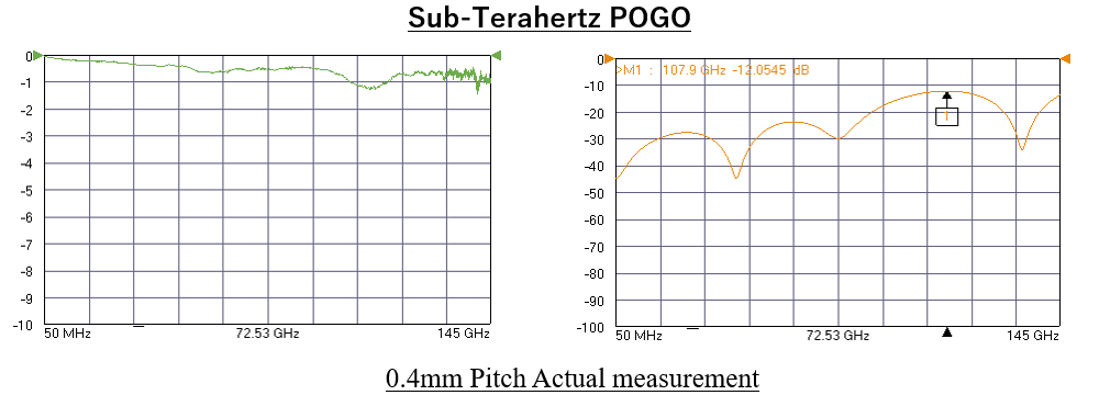 SERではVNA(ベクトルネットワークアナライザ)メーカー・シリコンフォトニクスベンダー等の要請を受け、コンタクトプローブの周波数上限を追求する中でサブテラヘルツ帯(150GHz)の通過特性を有するコンタクトを実現しました。